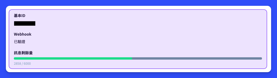 <figure><img src="https://842546780-files.gitbook.io/~/files/v0/b/gitbook-x-prod.appspot.com/o/spaces%2F-MNRu7dk70ei7JV9HlW9%2Fuploads%2FJL3DvfKAyS6uv0UOSmwK%2Fimage.png?alt=media&#x26;token=c851db15-6448-45cf-8c03-2ed2dae6cbee" alt=""><figcaption><p>你可以透過系統管理檢視單筆 LINE 官方帳號剩餘量</p></figcaption></figure>