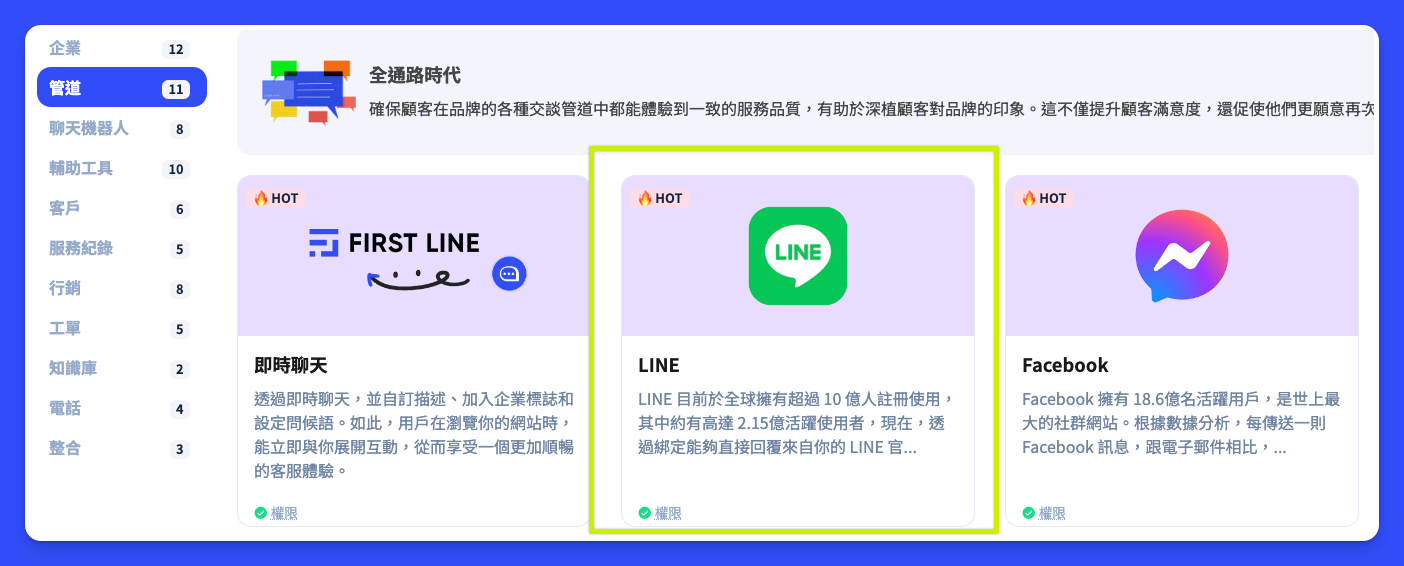 您可以經由左側選單中透過「管道」項目，點選「LINE 官方帳號」按鈕進入列表。