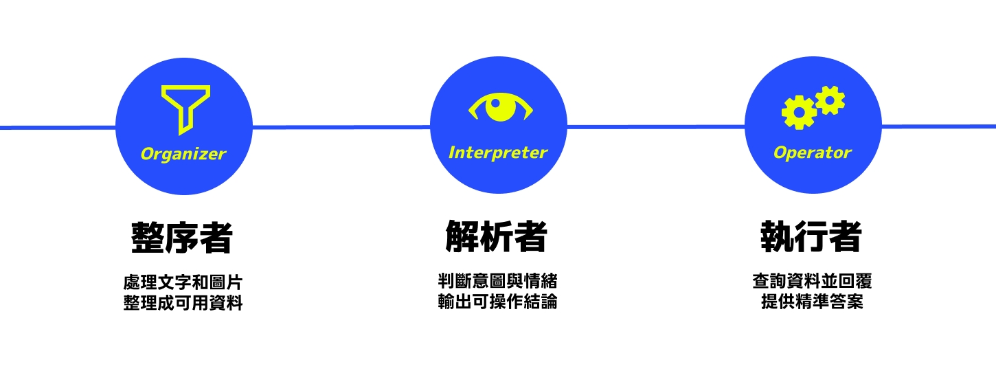 AI 客服不再是早期那種依賴制式回應的聊天機器人,而是一套能理解語意、判斷情境並執行動作的智慧化客服系統。為了讓企業在實際場景中保持可控、可調整、可量化,我們將 AI 能力拆分成三大核心角色,並以多個專職代理人負責不同任務,而不是倚賴單一、全能卻難以管理的巨型模型。
