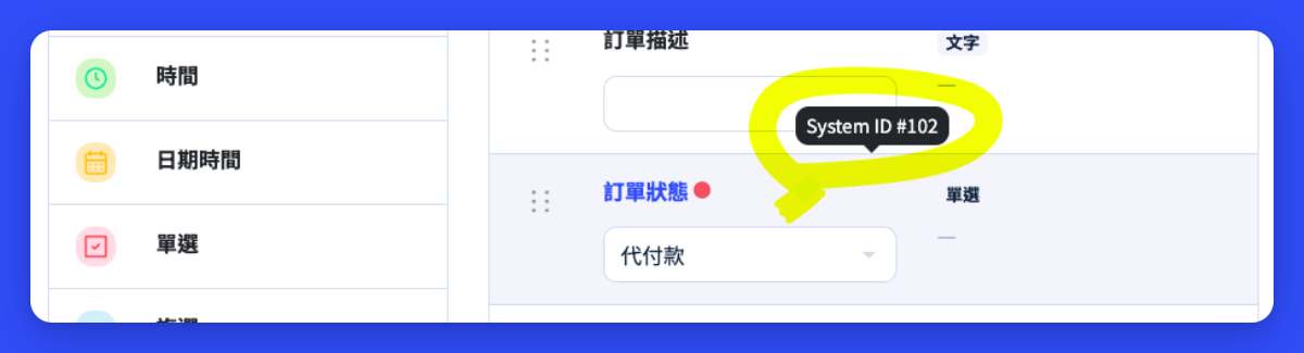 <figure><img src="https://842546780-files.gitbook.io/~/files/v0/b/gitbook-x-prod.appspot.com/o/spaces%2F-MNRu7dk70ei7JV9HlW9%2Fuploads%2FbtmCdJdp9azzcT2QLBfd%2Fimage.png?alt=media&#x26;token=b3c2f254-3d05-4bfe-bf4f-5668dc2ea371" alt=""><figcaption><p>系統編號，您可以在自訂欄位介面中查找。</p></figcaption></figure>