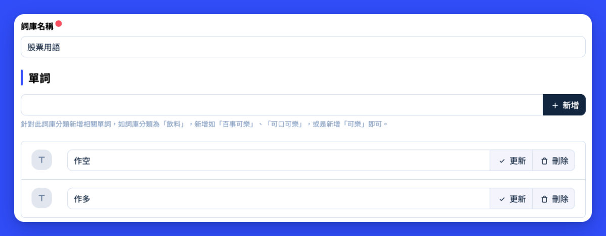 您可以透過「應用程式」中的「聊天機器人」分類，點擊「詞庫」以新增更多專有名詞，這有助於避免用戶的訊息被誤解。例如，若客戶輸入「要如何進行作空」，由於「作空」可能是特殊用語，您可以新增一個「股票」分類，然後在該分類中新增「作空」這個名詞，以提高對這類特殊用語的理解。這樣的設定有助於確保訊息更容易被理解。