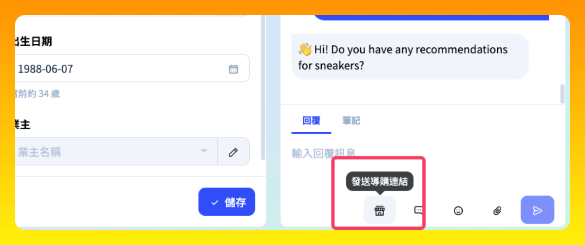 當客戶在訊息對話中發送消息要求購買產品時，專員可以從「發送導購連結」中選擇現有產品，並最多能選擇 10 個產品發送。
